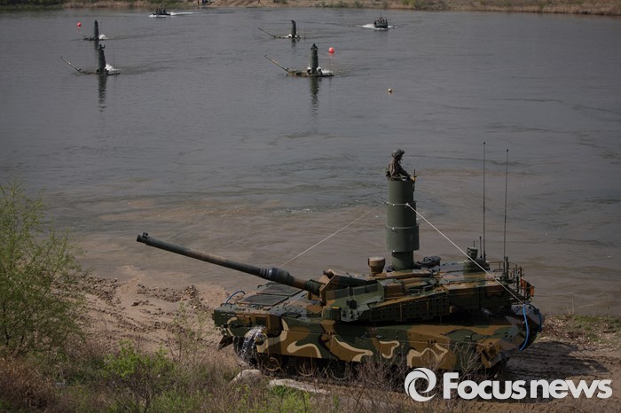 (여주=포커스뉴스) 19일 오전 경기도 여주시 남한강 일대에서 육군 20사단이 K-2 흑표전차 잠수도하훈련을 하고 있다. K-2흑표전차는 최고 4.1m수심의 하천을 문교나 부교없이 독자적으로 건널 수 있다.