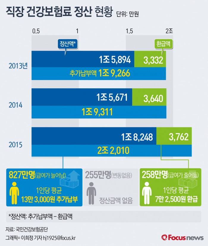 (서울=포커스뉴스) 19일 보건복지부와 국민건강보험공단이 발표한 보수변동에 따른 2015년도분 건강보험료 정산 결과에 따르면 직장가입자 1,340만명 중 1,085만명에게 1조8,248억원의 정산보험료가 발생한 것으로 나타났다.