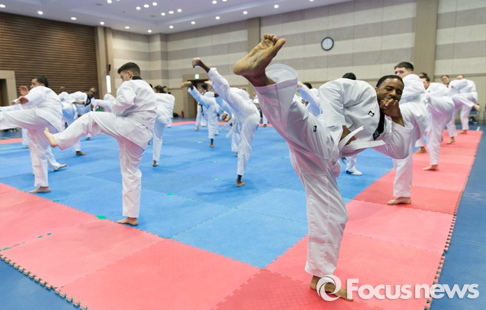 (서울=포커스뉴스) 19일 오후 서울 용산구 국방부 다목적홀에서 한국문화 체험행사에 참가한 주한미군 장병들이 태권도를 배우고 있다.