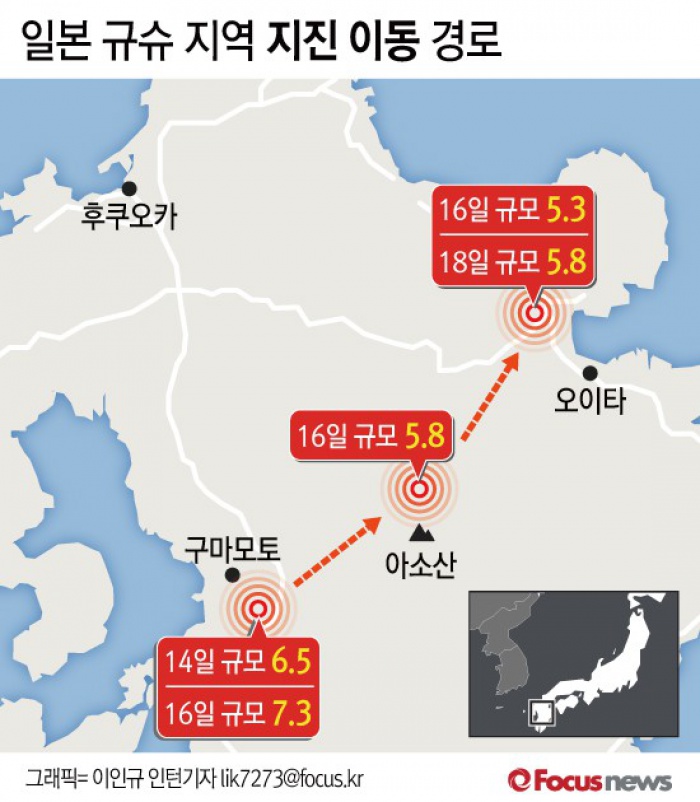 (서울=포커스뉴스) 일본 규슈 지역에서 잇따르고 있는 지진의 진앙이 북동쪽으로 이동함에 따라, 일본 내 광범위한 지역을 건드리는 대지진의 전조일 수 있다는 우려가 나오고 있다.