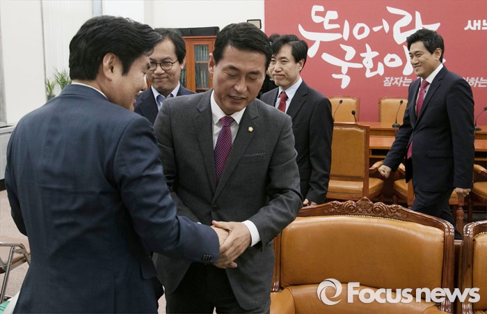 (서울=포커스뉴스) 원유철 새누리당 원내대표가 19일 오후 서울 여의도 국회에서 원 원내대표의 비상대책위원회 체제에 반대 입장을 가진 의원 및 당선인으로 구성된 당 혁신모임(가칭) 소속 의원들과 면담에 앞서 인사하고 있다. 왼쪽부터 원 원내대표, 김영우, 황영철, 하태경, 오신환 의원.
