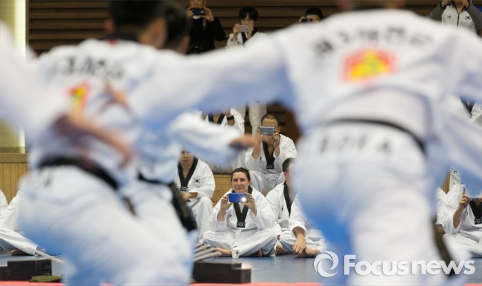 (서울=포커스뉴스) 19일 오후 서울 용산구 국방부 다목적홀에서 한국문화 체험행사에 참가한 주한미군 장병들이 국방부 태권도 시범단을 촬영하고 있다.