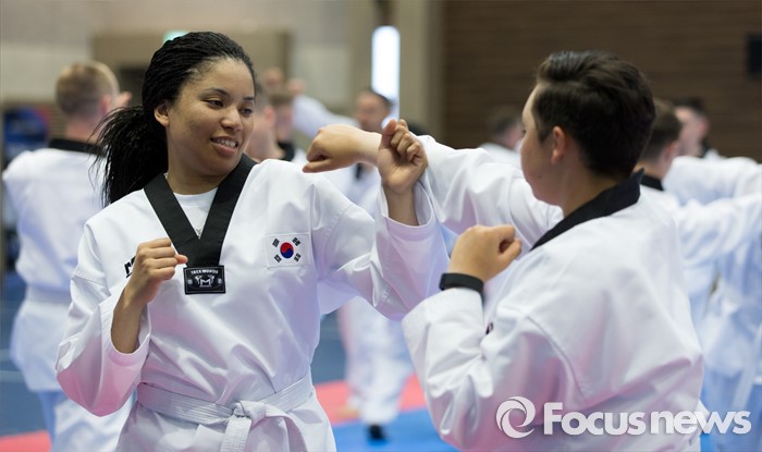(서울=포커스뉴스) 19일 오후 서울 용산구 국방부 다목적홀에서 한국문화 체험행사에 참가한 주한미군 장병들이 태권도를 배우고 있다.