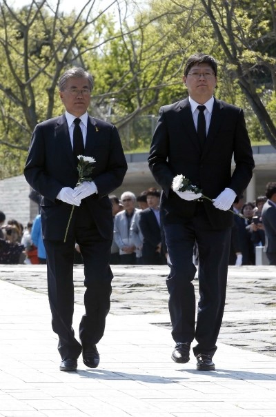 (서울=포커스뉴스) 문재인(왼쪽) 더불어민주당 전 대표와 故 김대중 전 대통령의 삼남 김홍걸 국민통합위원장이 19일 경남 김해 봉하마을을 방문해 故 노무현 전 대통령 묘역 참배를 하고 있다. <사진제공=문재인 의원 블로그>