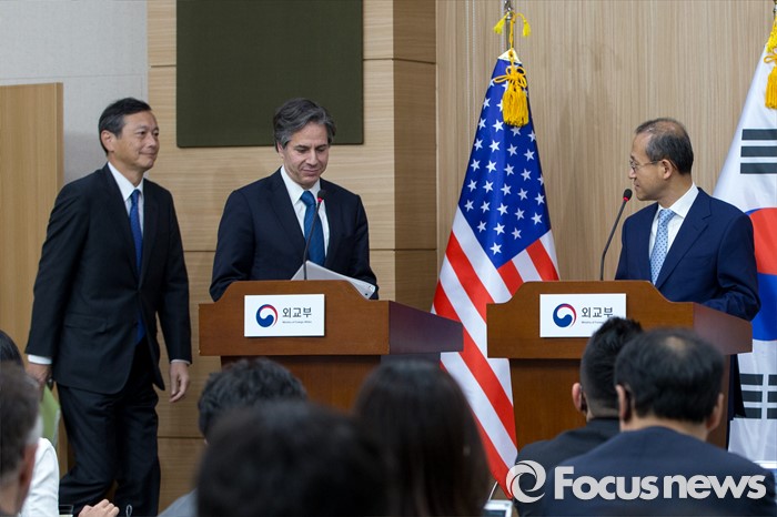 (서울=포커스뉴스) 한미일 외교차관이 19일 오후 서울 종로구 외교부에서 '제3차 한미일 외교차관 협의회' 결과 발표를 하기 위해 브리핑실로 들어서고 있다. 왼쪽부터 사이키 아키타카 일본 외무성 사무차관, 토니블링컨 미국 국무부 부장관, 임성남 외교부 제1차관.