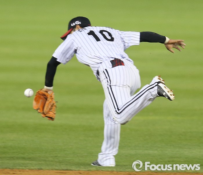 (서울=포커스뉴스) 19일 서울 잠실구장에서 열린 2016 프로야구 NC-LG 경기 5회초 2사 1루에서 NC 이종욱의 타구를 LG 2루수 이천웅이 역동작으로 잡으려다 놓치고 있다.