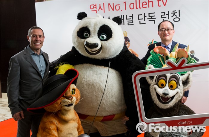 (서울=포커스뉴스) 20일 오전 서울 중구 그랜드 앰버서더 호텔에서 열린 '올레tv 드림웍스 채널 출시' 기자간담회에 참석한 에릭 엘렌보겐(왼쪽) 드림웍스 해외TV사업 대표와 강국현 KT 마케팅본부장이 드림웍스 매니메이션 캐릭터 인형옷을 입은 모델들과 함께 포즈를 취하고 있다.