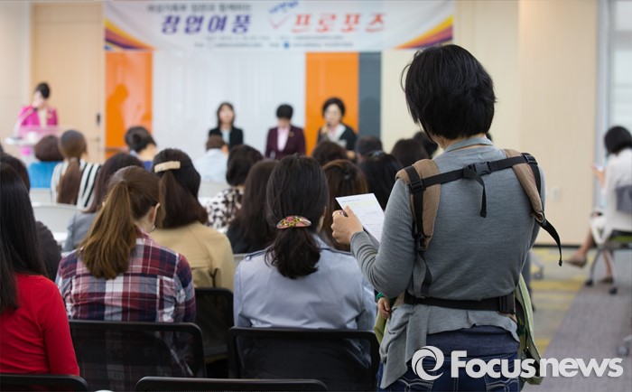 (세종=포커스뉴스) 20일 오전 세종시 조치원읍 세종창조경제혁신센터에서 열린 창업여풍 세 번째 프로포즈 여성가족부장관과 함께하는 토크콘서트에서 참석자가 아이를 안고 토크콘서트를 바라보고 있다.