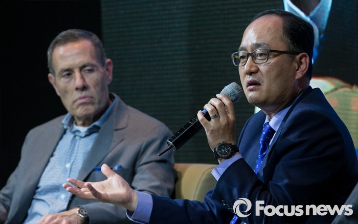 (서울=포커스뉴스) 20일 오전 서울 중구 그랜드 앰버서더 호텔에서 열린 '올레tv 드림웍스 채널 출시' 기자간담회에 참석한 강국현 KT 마케팅본부장이 취재진의 질문에 답하고 있다. 왼쪽은 에릭 엘렌보겐 드림웍스 해외TV사업 대표.