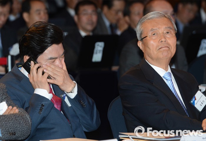 (서울=포커스뉴스) 원유철 새누리당 원내대표가 20일 오전 서울 중구 을지로 롯데호텔에서 열린 2016 한국포럼에 참석해 심각한표정으로 통화를 하고 있다. 오른쪽은 김종인 더불어민주당 비대위 대표.