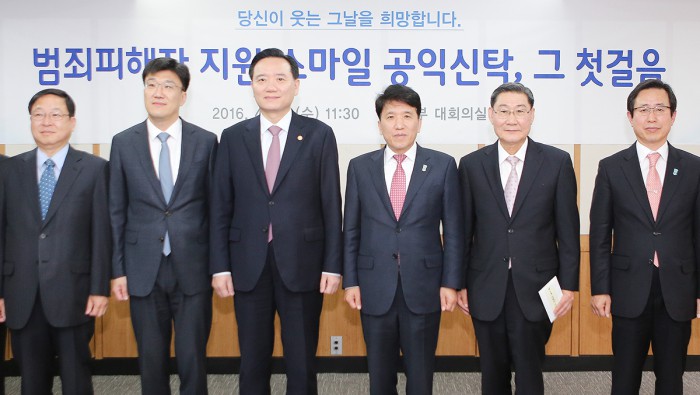이날 출범식 행사에는 과천 정부청사 내 법무부 대회의실에서 김현웅 법무부 장관, 함영주 KEB하나은행장, 김갑식 전국범죄피해자지원연합회장 등 50여명이 참석한 가운데 진행됐다.범죄피해자 지원 스마일 공익신탁' 출범식 참석자들이 기념촬영을 하고 있다. 사진 왼쪽 세번째부터 김현웅 법무부 장관, 함영주 KEB하나은행장(왼쪽 네번째), 김갑식 전국범죄피해자지원연합회장(왼쪽 다섯번째).<사진제공=KEB하나은행>