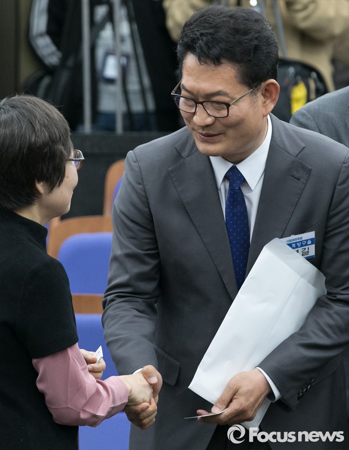 (서울=포커스뉴스) 20일 오전 서울 여의도 국회에서 열린 더불어민주당 20대 총선 당선자 대회에 참석한 송영길 당선인이 동료 당선인들과 인사하고 있다.