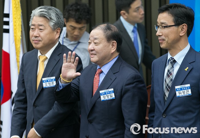 (서울=포커스뉴스) 20일 오전 서울 여의도 국회에서 열린 더불어민주당 20대 총선 당선자 대회에 제주도 지역에서 당선한 오영훈(왼쪽부터), 강창일, 위성곤 당선인이 인사말을 하고 있다.