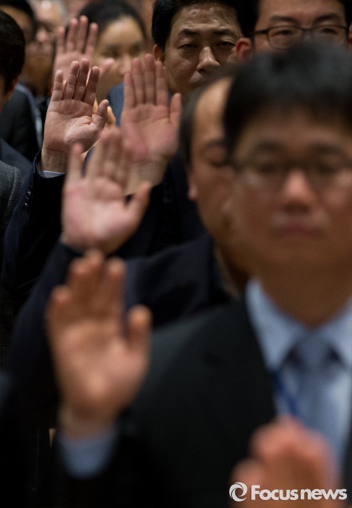 (서울=포커스뉴스) 20일 오후 서울 송파구 교통회관에서 택시노사 4개 단체 및 택시업계 종사자들이 교통안전 향상 결의문 선서를 하고 있다.