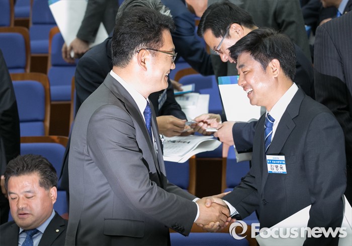 (서울=포커스뉴스) 20일 오전 서울 여의도 국회에서 열린 더불어민주당 20대 총선 당선자 대회에 참석한 송영길(왼쪽), 김병욱 당선인이 인사하고 있다.