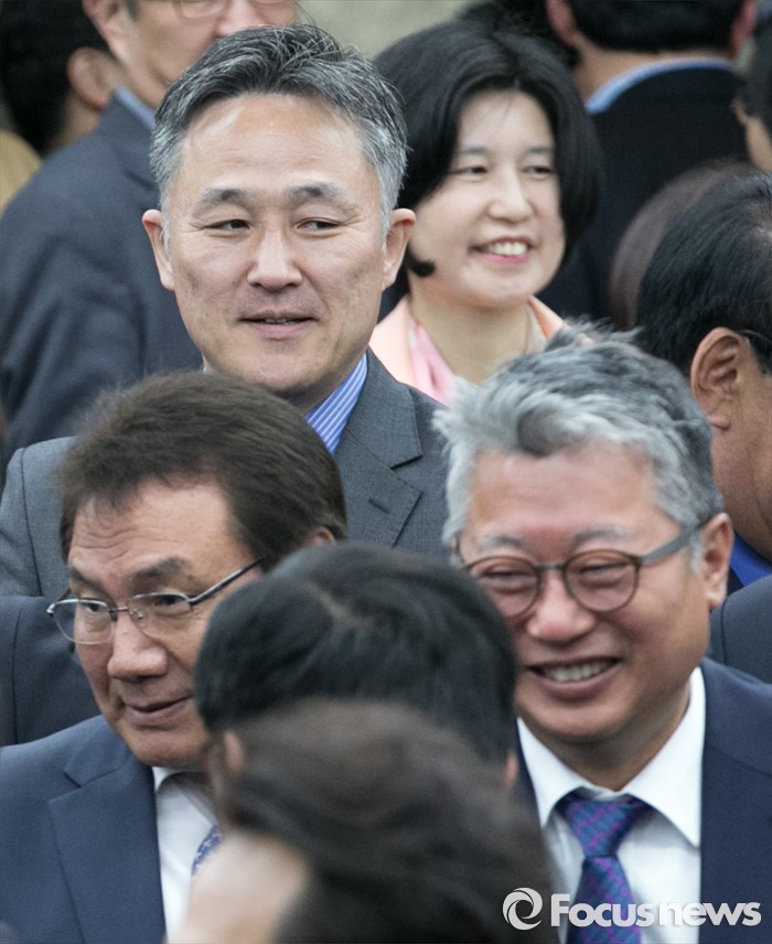 (서울=포커스뉴스) 20일 오전 서울 여의도 국회에서 열린 더불어민주당 20대 총선 당선자 대회에 참석한 표창원, 조응천 당선인 등이 동료 당선인들과 인사하고 있다.