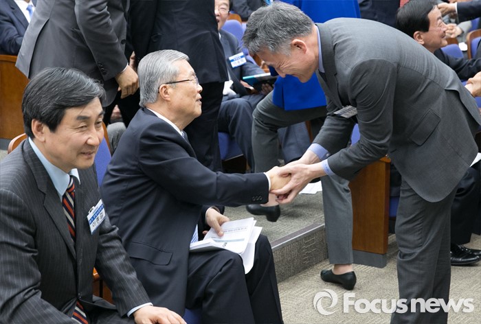 (서울=포커스뉴스) 20일 오전 서울 여의도 국회에서 열린 더불어민주당 20대 총선 당선자 대회에 참석한 김종인(가운데) 비대위 대표와 표창원(오른쪽) 당선인이 인사하고 있다.