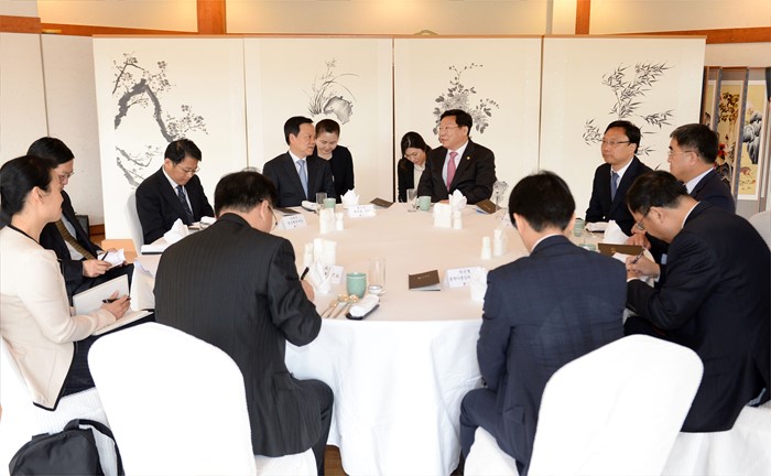 (서울=포커스뉴스) 주형환 산업통상자원부 장관이 20일 오전 서울 성북구 삼청각에서 천민얼(陳敏尒) 중국 귀주성 당서기와의 면담을 갖고, 한중 자유무역협정(FTA) 시대 통상투자 협력강화 및 산업협력 증진 방안에 관해 의견을 교환하고 있다. <사진제공=산업통상자원부>