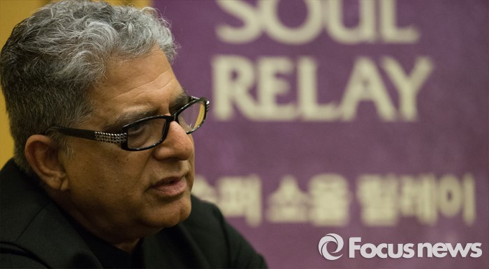 (서울=포커스뉴스) 토크쇼 여왕 오프라 윈프리와 팝가수 레이디가가, 마돈나의 정신적 지주이며 스승으로 알려진 하버드대 의학박사 디팍 초프라(Deepak Cfopra)가 20일 오후 서울 광진구 워커힐 호텔에서 열린 '2016 슈퍼 소울 릴레이' 힐링 콘서트 강연에 앞서 취재진 질문에 답변하고 있다.