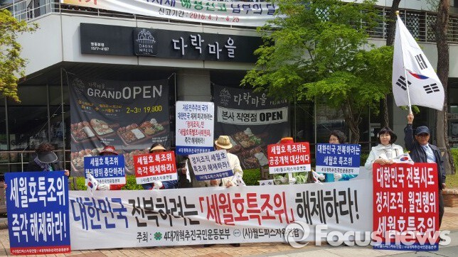 월드피스자유연합 등 보수성향 시민단체는 20일 서울 중구 세월호 특조위 사무실 앞에서 '제85차 세월호 특조위 해체 촉구' 집회를 열었다.