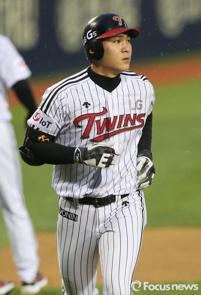 | △ 타구가 떨어진 지점을 바라보며 홈인하는 오지환 |