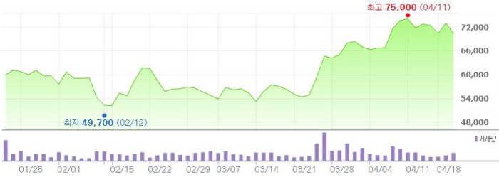 그는 "다만 한솔케미칼의 주가는 지난해 6월 10만원을 웃돈 이후 올 1분기까지 장기 조정을 거쳤다"고 덧붙였다.최근 3개월간 한솔케미칼 주가 추이 <그래픽출처=네이버>