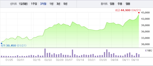 한화테크윈은 21일 오전 9시33분 현재 전일 대비 4.38%(1850원) 상승한 4만4050원에 거래되고 있다. 한화테크윈의 주가는 장 초반 4만3500원까지 오르며 52주 신고가를 경신하기도 했다.