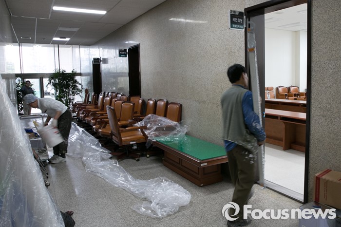 (서울=포커스뉴스) 21일 오전 서울 여의도 국회 본관에서 국민의당 대표실과 원내대표실 등 집무실 공사가 한창 진행되고 있다.