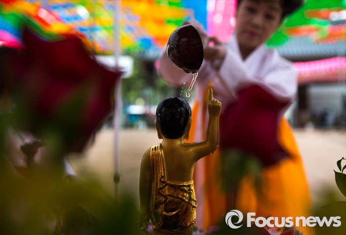 (서울=포커스뉴스) 한 불자가 21일 오전 서울 종로구 조계사에서 관불의식을 하고 있다. 관불은 불교의식으로 탄생불의 형상에 물을 부어 씻겨 자신의 마음에 쌓인 죄와 번뇌를 맑고 깨끗하게 만들어 복을 누리게 된다고 알려진 의식이다.