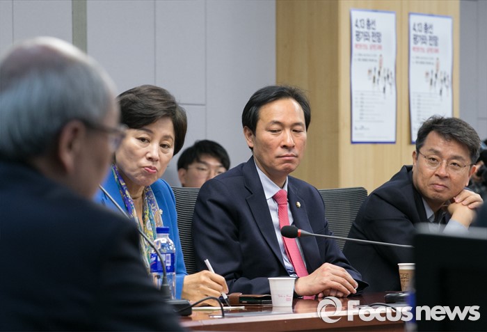 (서울=포커스뉴스) 21일 오전 서울 여의도 국회 의원회관에서 더미래연구소와 더좋은미래 모임 공동주최로 열린 4·13 총선 평가와 전망 확인된 민심, 남겨진 과제 토론회에 참석한 이철희(오른쪽부터) 더불어민주당 전략기획위원장, 우상호, 남인순 의원이 손혁재 경기대학교 정치전문대학원 초빙교수의 발언을 듣고 있다.