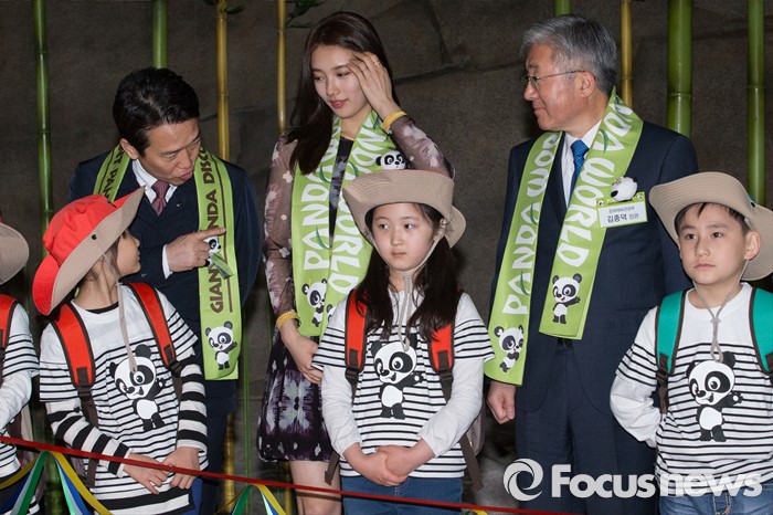 (용인=포커스뉴스) 21일 오전 경기도 용인시 에버랜드에서 열린 '판다월드 개관식'에서 남경필 경기도지사가 어린이에게 미쓰에이 수지를 소개하고 있다.