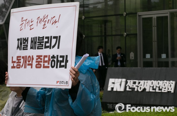 (서울=포커스뉴스) 21일 오전 서울 여의도 전경련회관 앞에서 재벌사내유보금환수운동본부 등 관련단체 회원들이 재벌사내유보금 현황발표 및 환수운동 선포 기자회견을 하고 있다
