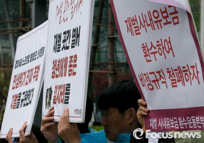 (서울=포커스뉴스) 21일 오전 서울 여의도 전경련회관 앞에서 재벌사내유보금환수운동본부 등 관련단체 회원들이 재벌사내유보금 현황발표 및 환수운동 선포 기자회견을 하고 있다