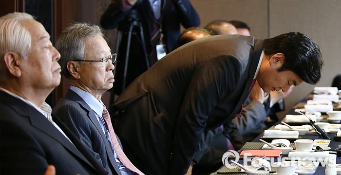 (서울=포커스뉴스) 원유철(왼쪽 세번째) 새누리당 원내대표가 21일 오후 서울 여의도 LG트윈타워의 한 중식당에서 상임고문단 오찬회에 참석해, 허리숙여 인사하고 있다.
