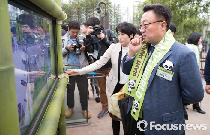 (용인=포커스뉴스) 21일 오전 경기도 용인시 에버랜드에서 열린 '판다월드 개관식'에서 고동진 삼성전자 사장이 시설을 살펴보고 있다.