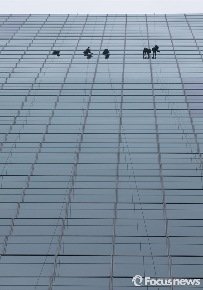 (서울=포커스뉴스) 비가 내린 21일 오전 서울 여의도 전경련회관에서 청소업체 관계자들이 회관 외벽 청소를 하고 있다.