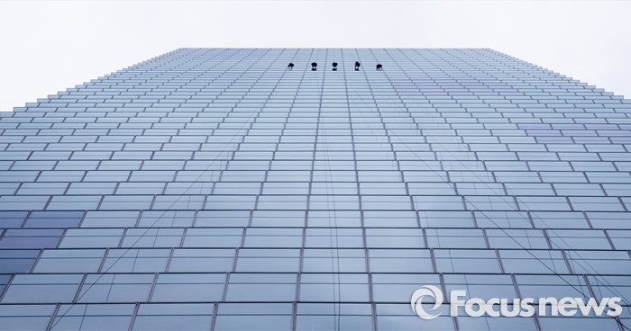 (서울=포커스뉴스) 비가 내린 21일 오전 서울 여의도 전경련회관에서 청소업체 관계자들이 회관 외벽 청소를 하고 있다.