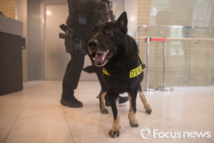 (서울=포커스뉴스) 21일 오후 서울 중구 명동예술극장에서 열린 대테러훈련에 참가한 경찰견이 관객석에 폭발물을 탐지하기 위해 들어서고 있다.