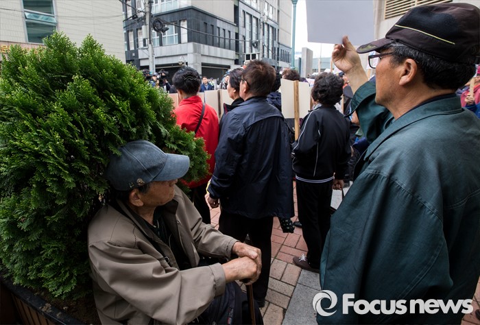 (서울=포커스뉴스) 최근 전경련의 차명계좌 자금 지원 의혹을 받고 있는 어버이연합 회원들이 21일 오후 서울 용산구 시사저널 사옥 앞에서 시사저널 규탄 기자회견을 하고 있다.