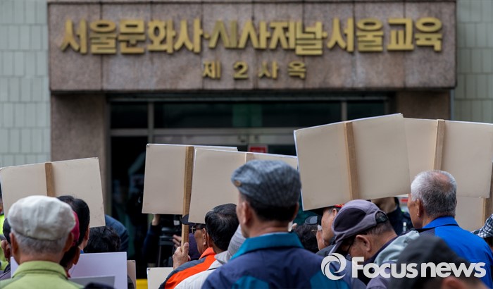 (서울=포커스뉴스) 최근 전경련의 차명계좌 자금 지원 의혹을 받고 있는 어버이연합 회원들이 21일 오후 서울 용산구 시사저널 사옥 앞에서 시사저널 규탄 기자회견을 하고 있다.