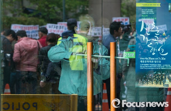 (서울=포커스뉴스) 최근 전경련의 차명계좌 자금 지원 의혹을 받고 있는 어버이연합 회원들이 21일 오후 서울 용산구 시사저널 사옥 앞에서 시사저널 규탄 기자회견을 가졌다. 이날 시사저널 사옥의 관리인이 정문을 폐쇄하고 있다.