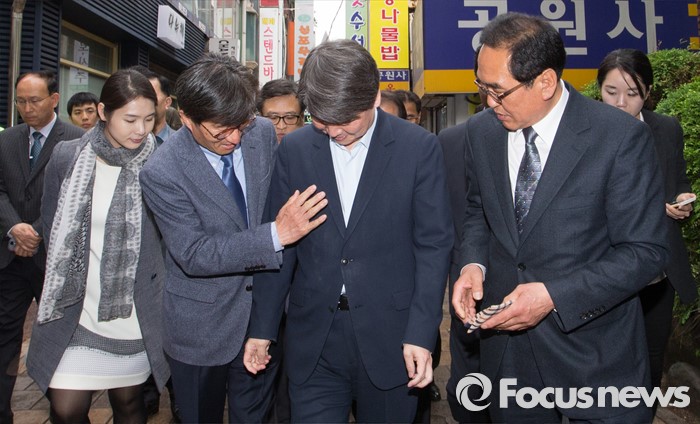 (청주=포커스뉴스) 안철수 국민의당 상임공동대표가 21일 오후 충북 청주 상당구 성안길을 찾아 시민들과 인사를 하던중, 천막에서 떨어진 빗을 맞자 당원들이 닦아주고 있다. 안 대표는 4.13 국회의원선거에서 국민의당을 지지해준 것에 대한 감사의 뜻을 전했다.