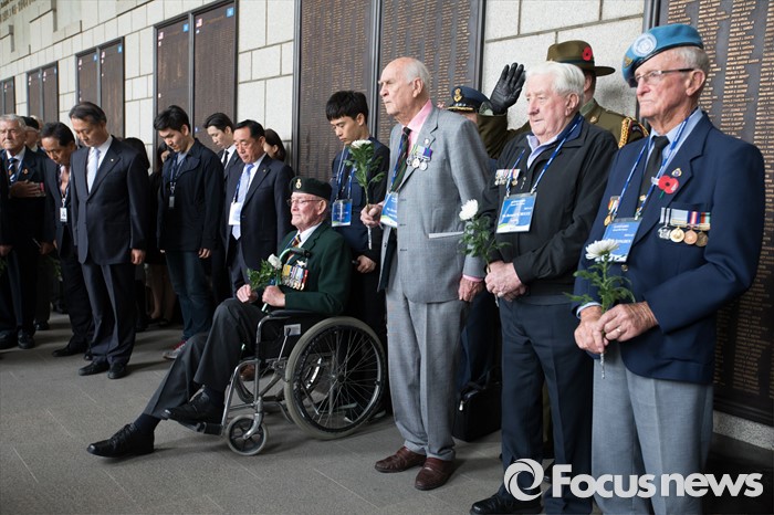 (서울=포커스뉴스) 임진강 및 가평전투 65주년을 맞은 21일 오후 서울 용산구 전쟁기념관에서 6.25전쟁에 참전했던 영연방(영국, 캐나다, 호주, 뉴질랜드) 참전용사들이 묵념을 하고 있다.