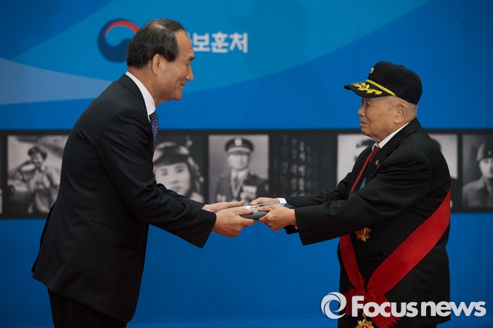 (서울=포커스뉴스) 21일 오후 서울 용산구 전쟁기념관에서 열린 6.25 전쟁영웅 선정패 수여식에서 박승춘 국가보훈처장이 전쟁영웅으로 선정된 최득수 이등상사에게 전쟁영웅패를 전달하고 있다.
