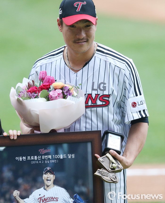 (서울=포커스뉴스) 21일 서울 잠실구장에서 열린 2016 프로야구 NC-LG 경기에서 LG 투수 이동현이 프로통산 100홀드 달성 기념패를 수상하고 기념사진을 찍고 있다.