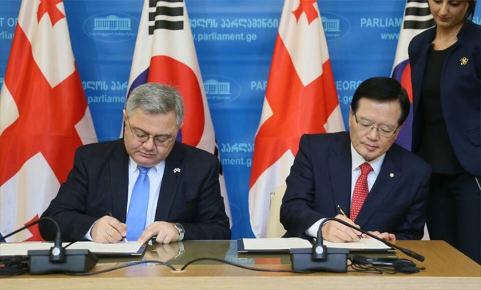 (서울=포커스뉴스) 정의화(오른쪽) 국회의장이 21일 오전(현지시각) 조지아 의회에서 우스파쉬빌리(David Usupashvili) 조지아 국회의장과 한·조지아 의회 간 협력 양해각서(MOU)를 체결한 뒤 서명하고 있다. <사진제공=국회>