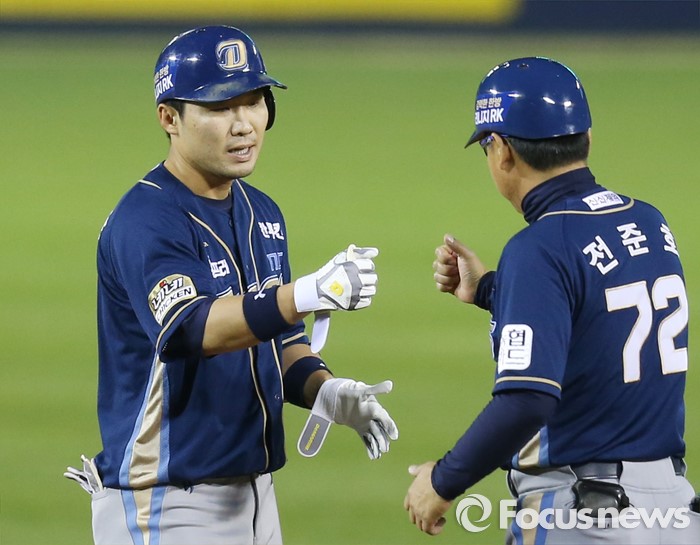 (서울=포커스뉴스) 21일 서울 잠실구장에서 열린 2016 프로야구 NC-LG 경기 4회1사 2,3루에서 NC 지석훈의 중견수를 넘기는 2타점 2루타를 치고 전준호 코치와 주먹을 마주치고 있다.