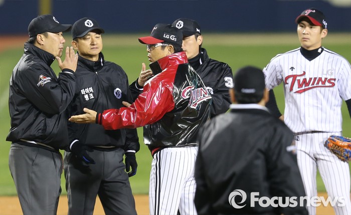 (서울=포커스뉴스) 21일 서울 잠실구장에서 열린 2016 프로야구 NC-LG 경기 5회 1사 1,2루에서 NC 이호준의 좌전안타때 LG 3루수 히메네스의 주루방해 판정에 양상문 LG 감독이 항의하고 있다.