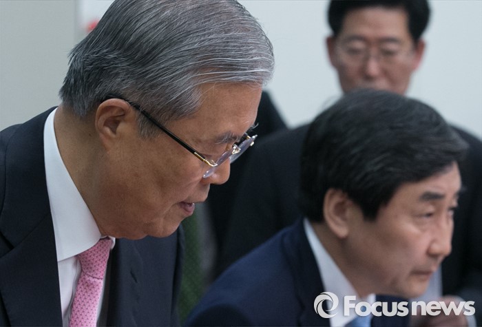 (서울=포커스뉴스) 김종인(왼쪽) 더불어민주당 비대위 대표, 이종걸 원내대표가22일 오전 서울 여의도 국회에서 열린 비상대책위원회의에 참석하고 있다.