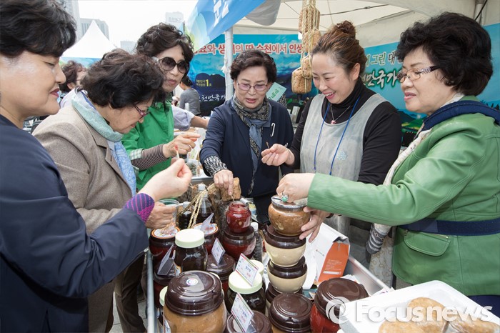 (서울=포커스뉴스) 22일 오전 서울 광화문 광장에서 열린 '2016 광주·전남 귀농귀촌 박람회' 순천시 부스에서 참석자들이 된장, 고추장을 비롯한 다양한 상품들을 시식하고 있다.